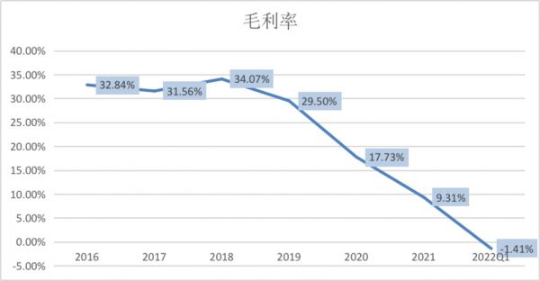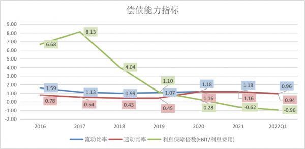 2022年一季度公司流动比率、速动比率分别为0.96和0.94,显示其短期偿债能力极弱。更不用提公司甚至连利息费用也难以覆盖,近几年的利息保障倍数走势也透露了其利息支付能力随着利润下滑而每况愈下。