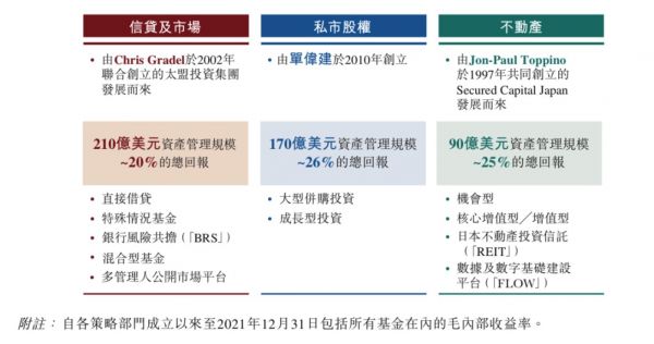 后来,太盟投资确立了信贷及市场、私募股权以及不动产三大核心策略部门,总资产管理规发展至模约500亿美元(约人民币3183亿元),这也让太盟投资又被称为“亚洲小黑石”。