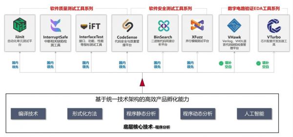 针对上述痛点,依托于国防科大、清华大学以及中科院等高校以及华为、Synopsys等行业内人才的技术和产业化背景,近年来,泛联新安自主研发了软件质量测试、软件安全测试和数字电路验证(EDA)三大类10余款产品。其中,软件质量测试工具主要解决现有工具自动化程度不高、测试用例覆盖率偏低,以及不适应国产软硬件平台等问题。软件安全测试工具主要解决安全检测规则覆盖不全、准确率不高、对规模化代码无法深度分析等问题。数字电路验证工具主要集中在数字电路前端验证领域,解决国产平台适配和自主发展的问题,特别针对了高端点工具突破的问题。