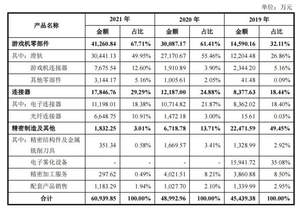 与此同时,公司的核心产品也发生了变化。2019年公司头号产品电子烟零部件——电子雾化设备实现了1.6亿元的收入,占比为35.1%,而2020年该产品却突然消失,取而代之的是游戏机零部件滑轨的崛起。2019年至2021年,滑轨带来的营收不断增长,分别实现收入1.22亿元、2.72亿元和3.04亿元,2021年其收入占比已达到49.95%。