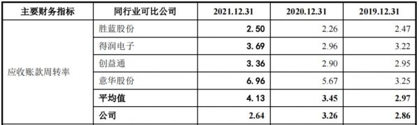 同时,公司应收账款周转率也呈下滑态势,报告期内分别为2.86次、3.26次和2.64次,且均低于可比公司均值,说明其应收账款管理能力较弱。值得关注的是,公司应收账款占比最多的客户依然是富士康,2021年公司对应富士康的应收账款为2.28亿元,占应收账款账面余额的比例高达77.92%。