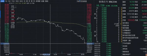 只是伴随着首次开盘的钟声,快狗打车的股价犹如过山车一般,开头响亮,收盘惨淡。首挂上市,快狗打车早盘冲高逾7%,股价达到23.15港元/股,市值一度超过137亿港元。然而不久便回落转跌。截至收盘,快狗打车跌幅超过22.23%,股价跌至16.72港元/股,跌破发行价21.50港元/股,总市值仅有102.9亿港元。