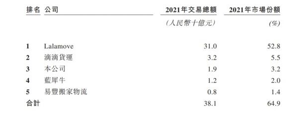 内地在线同城物流市场呈现出高度集中的态势,按照截至2021年的交易总额计算,货拉拉以52.8%的市场份额稳居行业第一,才成立2年的滴滴货运也超过快狗打车,以5.5%的市场份额位列行业第二。而快狗打车排名第三,市场份额仅有3.2%,与货拉拉的市场份额相差近50%,与滴滴货运相差2.3%。
