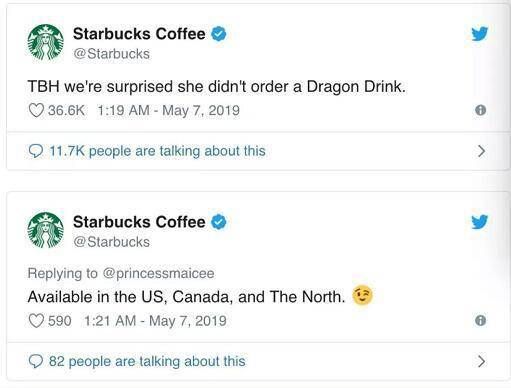 这个场景呈现在了新一季的权游中。在5日播出的第8季第4集《最后的史塔克》剧情中,龙母的桌前赫然出现了一个星巴克咖啡杯,被人误以为是星巴克的植入。该剧的执行制片人伯尼·考菲尔德(Bernie Caulfield)在接受WNYC电台采访时回应称,乱入的星巴克咖啡杯是一个穿帮错误。“我们很抱歉!”