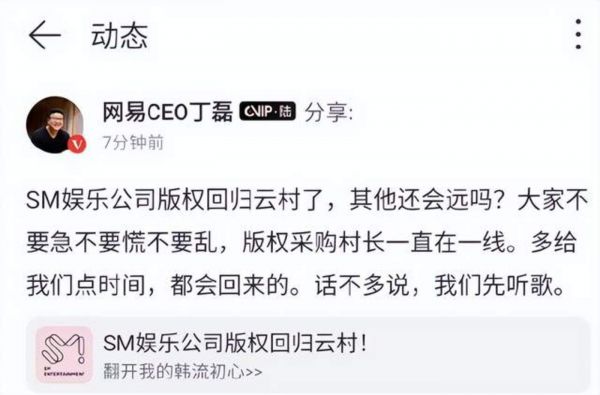 不过丁磊也有值得高兴的事。同日,TFBOYS版权回归网易云。消息一出,丁磊很快就在云村发了一条动态:“SM娱乐公司版权回归云村了,其他还会远吗?大家不要急不要慌不要乱,版权采购村长一直在一线。多给我们点时间,都会回来的。话不多说,我们先听歌。”