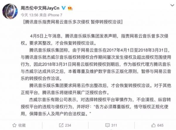 而腾讯给出的断供理由是“网易云音乐多次侵权”,周杰伦官方微博账号也转发了腾讯音乐的声明。