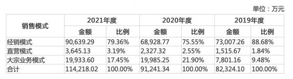 以2021年为例,经销模式毛利率为33.87%,大宗业务毛利率仅20.03%。而公司整体毛利率从2019年的34.49%降至31.93%,大宗业务占比升高也是原因之一。