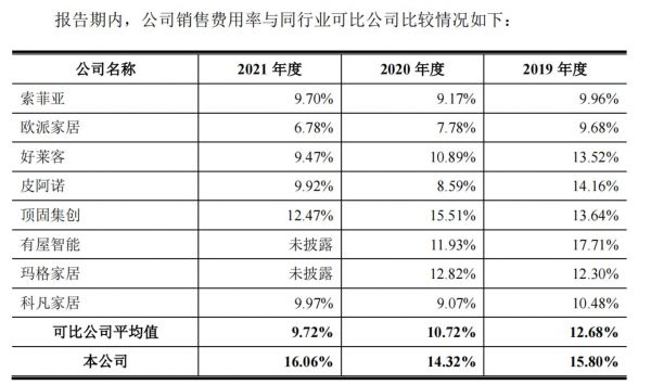 但实际上,由于诗尼曼业务规模较小、品牌影响力有待加强,公司不得不投入大量资金用于销售网络建设、市场推广和客户服务等方面。报告期内,公司销售费用分别为1.32亿元、1.32亿元和1.86亿元,销售费用率为15.80%、14.32%和16.06%,呈逐年上升趋势。与同行的其他公司相比,诗尼曼的销售投入率也是大幅“领先”。