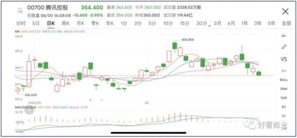 6月28日-30日,腾讯股价继续低开低走。截至6月30日收盘,腾讯市值已较Naspers公告前的高点蒸发超4400亿港元。