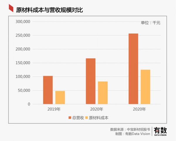 2021年,中宝新材营收约2.567亿元,光是采购原材料就花了1.25亿。过去三年,原材料成本占营收比重分别为46.7%、49.6%及48.8%。