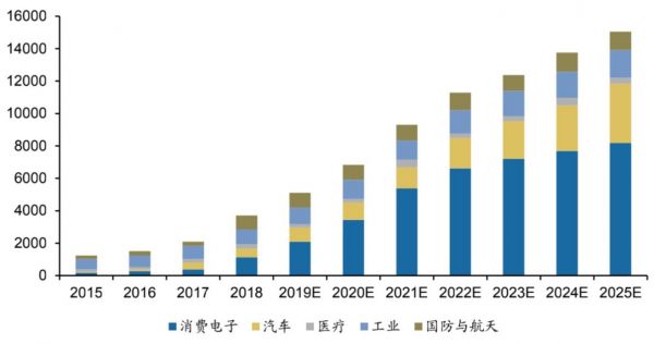 其中,智能手机领域的市场规模将从2019年的20.17亿美元增长至 2025年的81.65亿美元,年均复合增长率约为26%;汽车领域将从2019年的8.54亿美元增长至2025年的36.73亿美元,年均复合增长率约为28%。预计到2025 年,智能手机和汽车占总体市场规模的比例将分别达54%和25%。