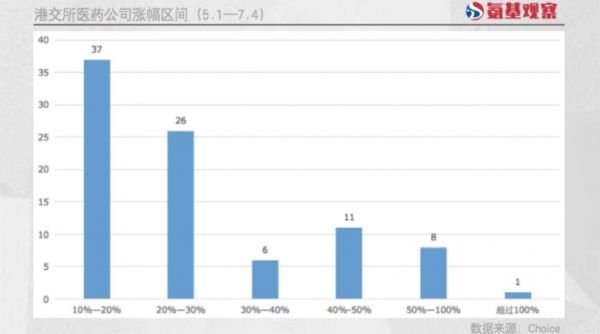 港股共有9家医药公司股价涨幅超过50%;A股这一数字则达到21家。如果把涨幅放宽至30%,两市“牛股”已经超过100家。