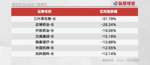 跌幅居前的三叶草生物,下探幅度甚至达到31.79%,迈博药业、开拓药业以及北海康成等公司跌幅同样不低。