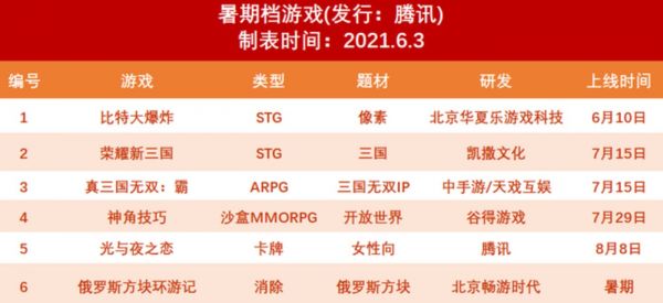 2021年6月,腾讯发布了6款暑期档游戏、网易公布了16款游戏更新,其中包括《遇见逆水寒》和《孤岛先锋》两款全新游戏。完美世界发布了旗下的两款大IP游戏《梦幻新诛仙》和《真三国无双霸》。