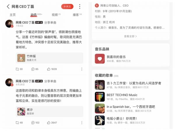 初始状态里,网易云音乐重视“人的推荐”,有DJ推荐和歌单页面。当时网易CEO丁磊的个人主页被放在了头图位置。点击进入,可以看到丁磊分享的音乐动态,第一条分享是单曲《Bongo Bong》,演唱者是一位有西班牙血统、出生于巴黎的拉丁民谣歌手。坊间流传的故事说,丁磊曾在巴西出差时买来唱片,却无法将其中音乐与同事分享,因此决定启动网易云音乐项目。能够侧面说明丁磊对网易云音乐重视的是,如今9年过去,丁磊的主页已经累积了近1600条动态,分享过国内外各种不同曲风的音乐。