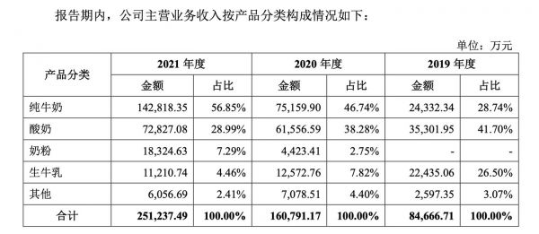 招股书显示,报告期内,认养一头牛主营业务收入主要来源于纯牛奶、酸奶、奶粉等乳制品以及生牛乳,上述各类产品各期收入占主营业务收入的比例分别为96.94%、95.59%和97.59%。