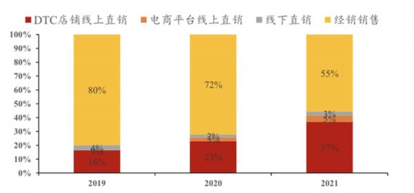 与之相对的,是微商直销渠道的营收占比越来越高:敷尔佳的线上直销收入3年翻了23倍,巨子生物在2021年靠直销卖了6.89亿,直销营收占比也提升到44.4%。