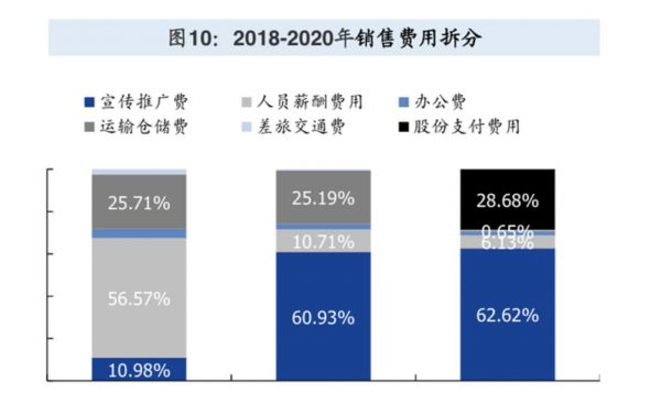 国盛证券在一份研报中进一步披露,敷尔佳的销售费用中占比最高的是宣传推广费,2019年和2020年都超过了60%。