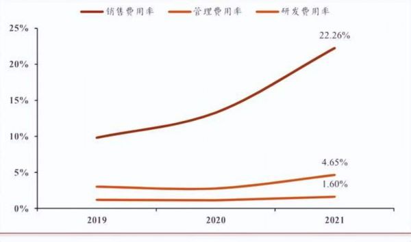 相较之下,巨子生物2021年的销售费用率为22.26%,较2019年增长12.45%,而同期研发费用仅增长0.41%至1.6%。