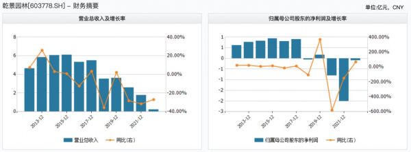乾景园林成立于2002年, 主营业务为园林工程施工、园林景观设计以及苗木种植与养护,2015年12月于上交所上市。但上市即巅峰,公司自上市后营收和利润就进入了下行通道,业绩一年不如一年。其营收规模已从2015年的6.08亿元降至2021年的1.77亿元,净利润更是连续两年亏损,2021年实现归母净利润-2.01亿元。
