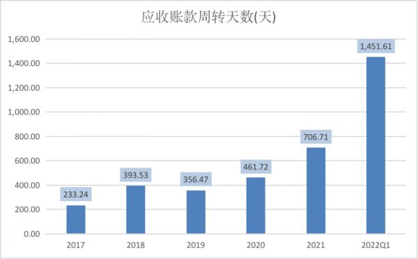 与此同时,公司还大量计提信用减值损失,导致亏损愈发严重。2021年,公司计提了1.14亿元的信用减值损失,主要为应收账款坏账损失。事实上,公司的应收账款长期居高不下,应收账款周转天数也越来越长。2021年其应收账款周转天数为706.71天,而今年一季度已增长至1451.61天,也就是说,公司的应收账款平均需4年时间才能收回。