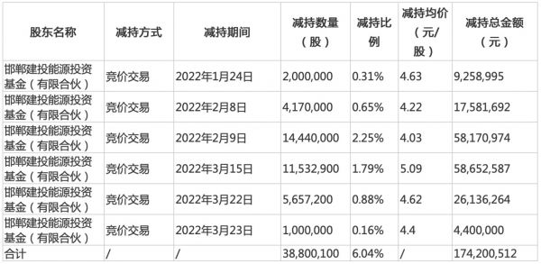 其中邯郸建投能源基金自2022年1月24日至2022年3月23日期间,通过集中竞价交易方式合计减持公司股份3880.01万股,减持完成后,邯郸建投的持股比例从年初的10.89%降至4.86%,套现总金额1.74亿元。