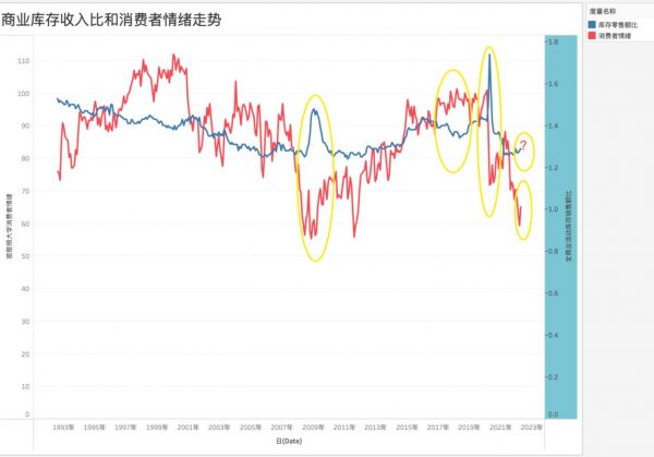我们引入了密歇根大学的消费者情绪和美国商业活动库存占营收比两组数据进行对比,在上图中我们标注了过去十余年内关键节点上两组数据的走势情况,如2008年,2018年,2020年,两组数据都呈现了明显的负相关性,也就是消费者情绪低沉,库存占比陡然上升,消费者情绪高涨,库存压力缓解,2022年之后,消费者情绪一路下滑,与此相伴的是库存占营收比仍然保持了比较稳定的态势。