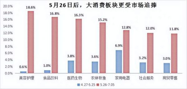 5月27日-7月5日,前期快速反弹的板块依旧给力,美容护理、食品饮料、医药生物、农林牧渔、家用电器等大消费板块也快速崛起,涨幅不遑多让。这一阶段申万一级行业涨幅前5名中,3个属于大消费板块,如果计入汽车板块,就有4个。