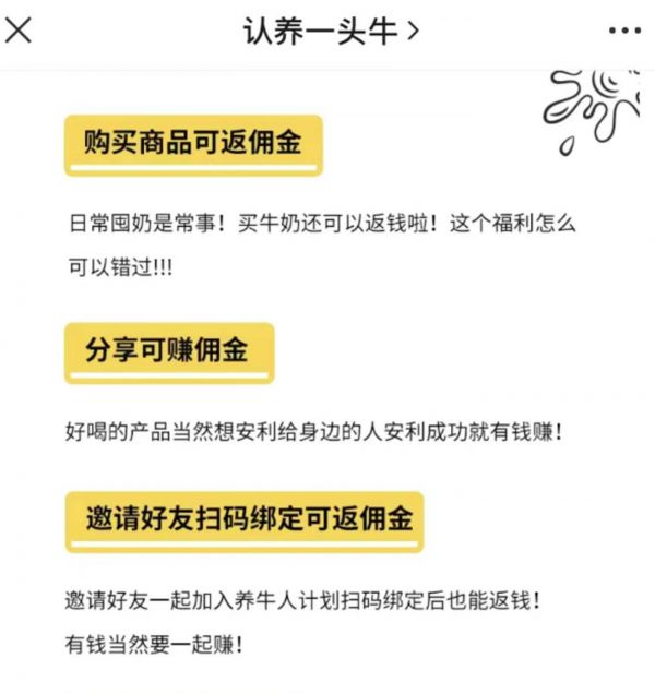 认养一头牛另一个争议点是2020年推出的“养牛人招募计划”,具体包括“购买商品可返佣金”“分享可赚佣金”“邀请好友扫码绑定可返佣金”等活动。