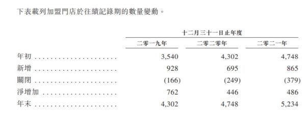 据招股书显示2019、2020和2021年新增门店分别为928家、695家和865家,关闭门店则分别为166家、249家、379家。在激烈的市场竞争中,肉眼可见的线下门店的增速已经放缓,说明越来越多的加盟商选择“急流勇退”。