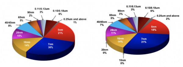 具体拆分收入来源,按技术划分,先进制程(7nm或更先进)的5nm订单占销售额的21%,上年同期为18%,7nm订单占销售额的30%,上年同期为31%。