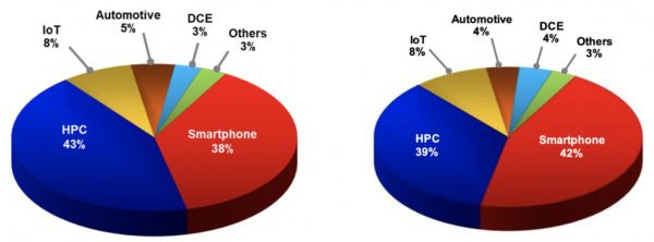 按终端应用划分,智能手机客户占收入的38%,上年同期为42%;高性能计算客户(HPC)占销售额的43%,上年同期为39%。汽车行业客户占台积电收入的5%,上年同期为4%。
