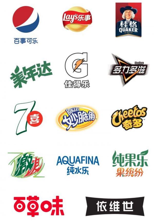 目前,百事公司旗下共有18个食品饮料品牌,包括百事可乐、佳得乐、激浪、百事轻怡、乐事 、百草味、立体脆、奇多、Aquafina、七喜、立顿茶、桂格麦片、Ruffles、美年达、Tostitos、Sierra Mist和菲多利。