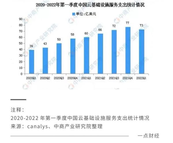 根据Canalys 6月初公布的数据,2022年第一季度,中国大陆云基础设施服务支出同比增长21%,达到73亿美元,领跑全球云服务市场的增长。另有IDC发布的《中国公有云服务市场(2021下半年)跟踪》显示,未来5年,中国公有云市场预计会以30.9%的复合增长率继续高速增长,2026年将达到1057.6亿美元。