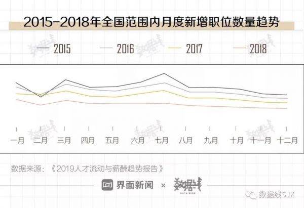对比近三年情况,2018年月度新增职位数量变动较小,整体趋稳。