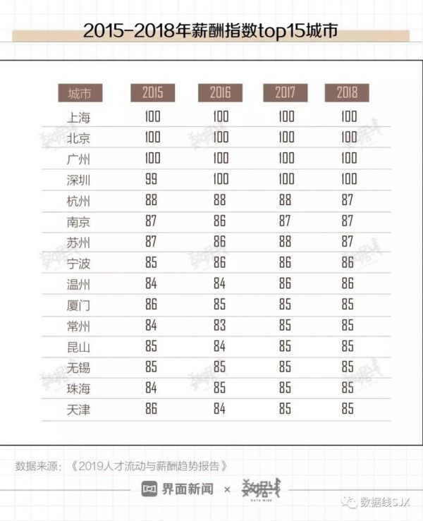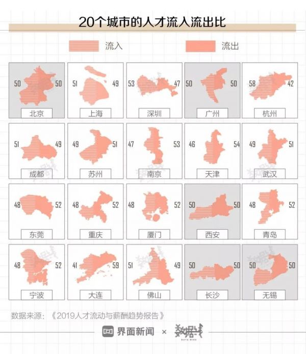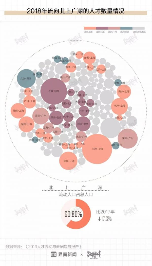 同时,一线城市依然是人才的重要“输入地”。据《2019人才流动与薪酬趋势报告》,2018年流向北上广深四城的人口在总流动人口中的占比超60%。