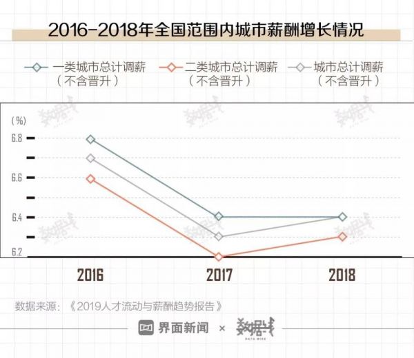 据《2019人才流动与薪酬趋势报告》,2018年,全国范围内薪酬总体增速6.4%,较去年上涨0.1个百分点。其中,二线城市从6.2%增长至6.3%,一线城市薪酬增长与2017年持平。