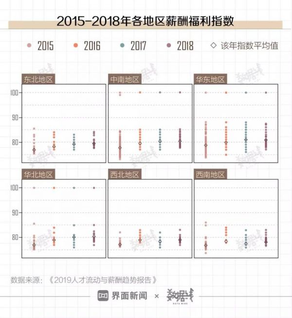 分地区来看,2015年至2018年,各地区薪酬福利水平差距也在逐年缩小。