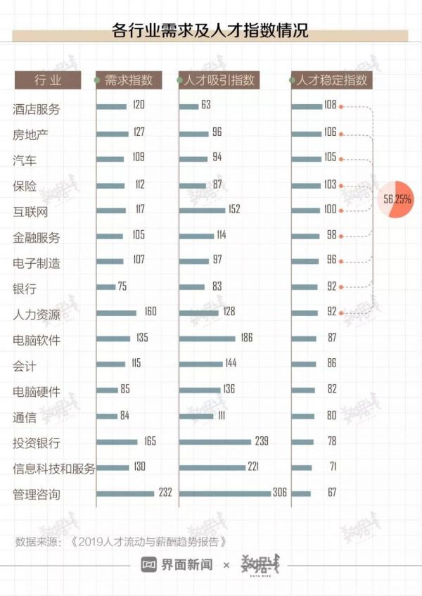 同时,在纳入统计的16个行业中,超半数行业的人才稳定指数(根据人才流动情况计算所得)在90分以上。