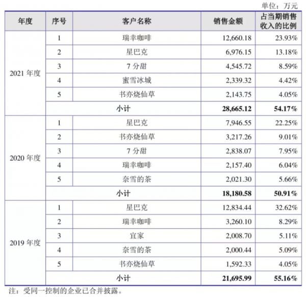 大客户在德馨食品的收入中影响很大——前五大客户合计占当期销售收入的一半比重。前几大重要客户维持在星巴克、瑞幸咖啡、宜家、奈雪的茶、书亦烧仙草、7分甜、蜜雪冰城、宜家。