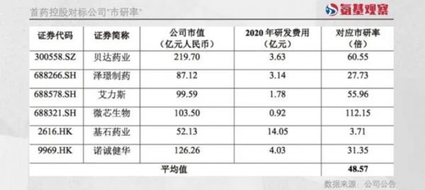 当然,不仅是益方生物,科创板其它biotech也将“市研率”作为定价依据。例如3月份上市的首药控股,发行后市研率为69.78倍,高于行业平均水平。其选取的比较对象为贝达药业、泽璟制药、艾力斯、微芯生物、基石药业和诺诚健华,最终得出可比较公司“市研率”平均值为48.57倍。