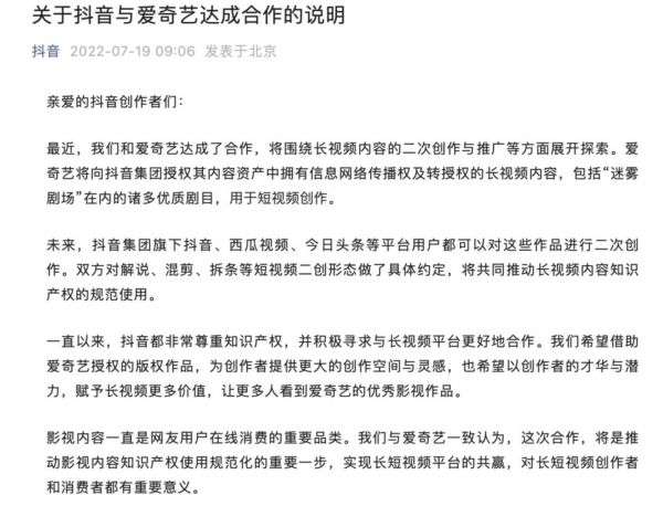 7月19日,抖音公众号宣布,抖音与爱奇艺达成合作,将围绕长视频内容的二次创作与推广等方面展开探索。爱奇艺将向抖音集团授权其内容资产中拥有信息网络传播权及转授权的长视频内容,包括“迷雾剧场”在内的诸多优质剧目,用于短视频创作。