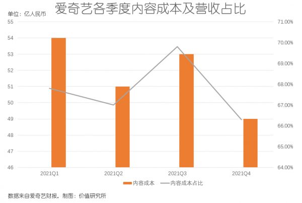 最典型的例子,是去年一季度。当季度爱奇艺内容成本录得54亿元,同比下降8%。但为此付出的代价,是整个季度只有1部网络电影进入票房榜Top 10、播映热度前10的剧集占比以6:8不敌腾讯视频、会员规模从2020年同期的1.189亿缩水至1.053亿……