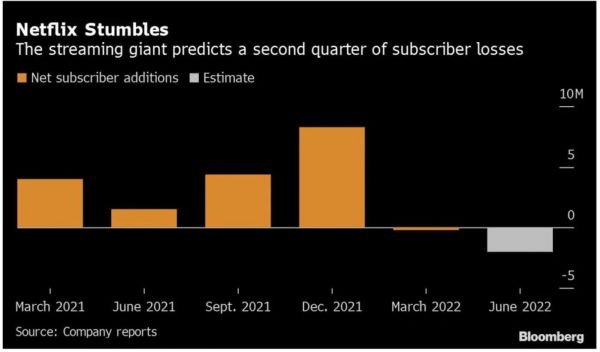 在上个季度的财报会上,Netflix的表态可以说已经是将“摆烂”进行到底。先是表示二季度预期收益会继续下滑,公司考虑引入广告求生,接着放话称全球付费用户将减少200万。吓得投资者们纷纷出逃,股价一度狂泻回了5年前。
