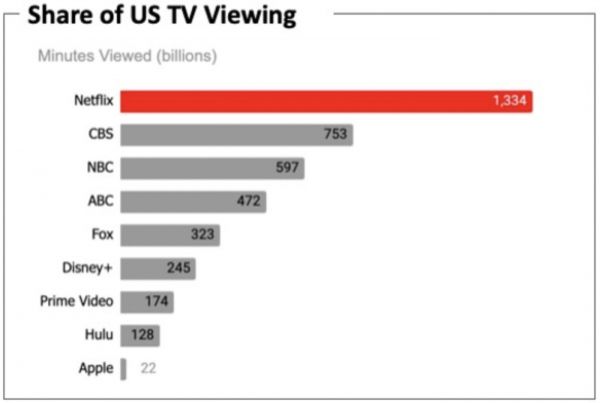 头部内容的溢价效应也确实得到了验证。爱奇艺一季度的爆款《人世间》、二季度的口碑热剧《警察荣誉》都是催化用户粘性提升、平台收入增长的关键因素。对于Netflix而言,爆款内容的效应更为明显,2021-2022电视季,Netflix的电视总观看时长远高于传统电视及流媒体平台。尼尔森数据显示,6月份Netflix在美国电视收视率中所占的份额达到了7.7%的历史新高。