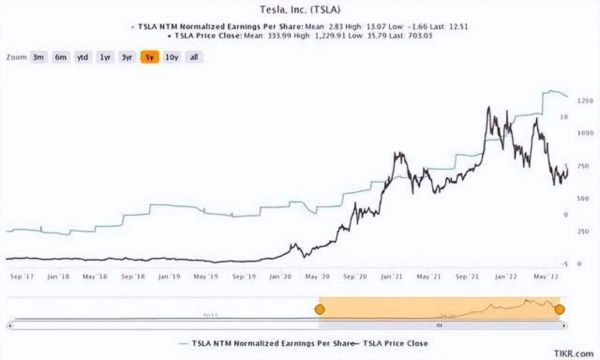 投资者可以了解TSLA调整后的每股收益趋势与其过去5年股价之间的关系。自TSLA从2020年疫情最低点大幅飙升以来,这一差距显著缩小。