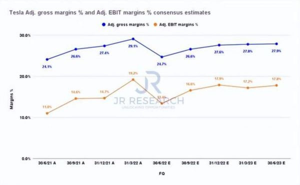 如上所述,对特斯拉第二季度整体毛利率的普遍预期(看多)被大幅修正为24.7%,远低于第一季度的29.7%。因此,特斯拉预计调整后的息税前利润为13.4%。如果情况属实,这将是特斯拉自21年第二季度低点以来的最差表现。