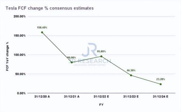 不幸的是,投资者可能需要准备好迎接失望。预计特斯拉的FCF增长将在24财年大幅放缓,达到23.2%。