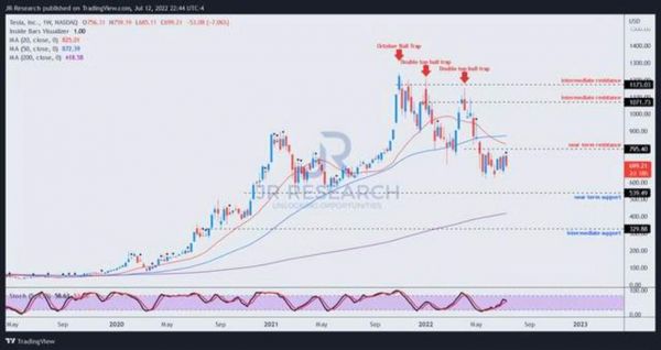 自我们上次更新其价格走势以来,已有重大进展。值得注意的是,近期的阻力位(800美元)已经得到验证,因为TSLA仍然处于该水平以下。尽管如此,目前的区域是积累期还是分布期还有待观察。