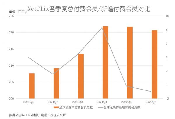 数据显示,Netflix二季度全球流媒体播放服务付费用户总数为2.2067亿,同比增长5.5%,但全球新增流媒体播放服务付费用户数仅录得-97万,连续两个季度陷入负增长,和去年二季度的154万人相比也有天壤之别。